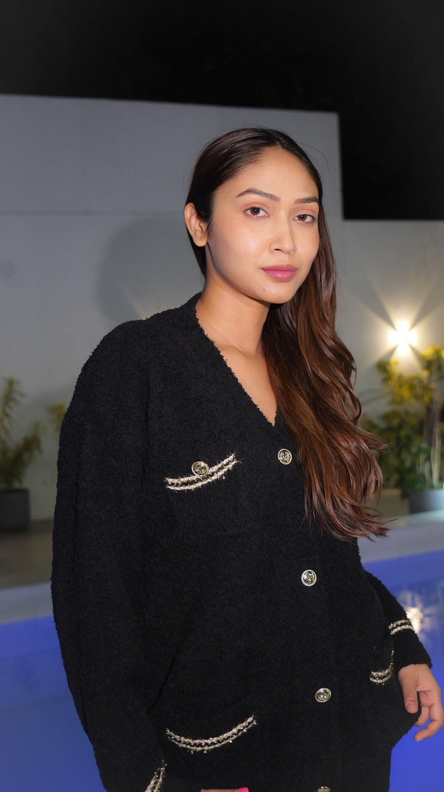The tailored button-down jacket features delicate pearl buttons, statement pockets, and subtle contrast trimming that elevates its luxurious feel. Paired with relaxed straight-fit bottoms, it offers both comfort and sophistication — perfect for cozy evenings, winter lounging, or stylish stay-at-home moments.