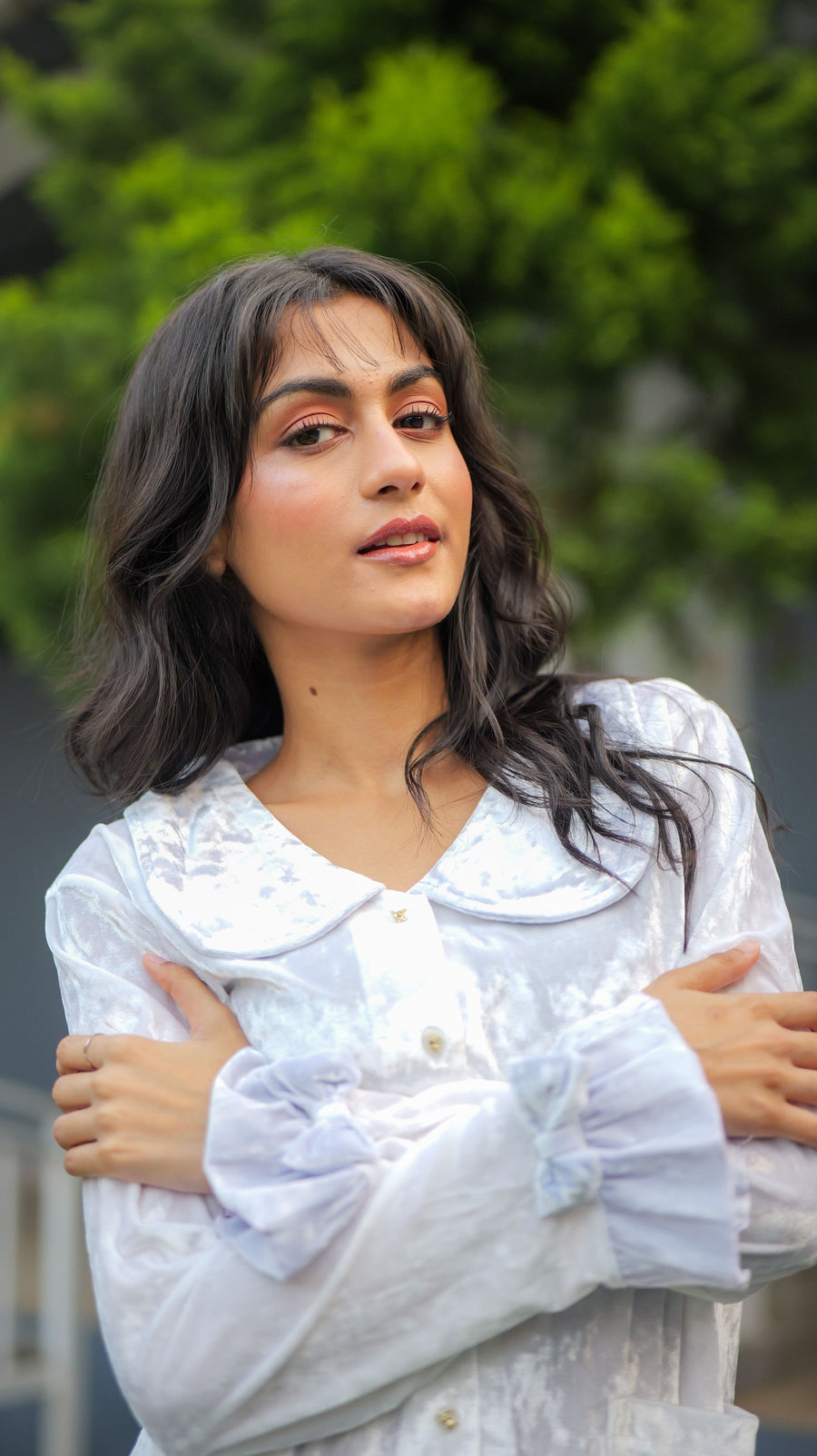 The delicate rounded collar adds a vintage-inspired charm, while the pearl-style front buttons enhance its refined look. Full-length sleeves with gentle gathered cuffs create a feminine silhouette, perfectly balancing comfort and sophistication.